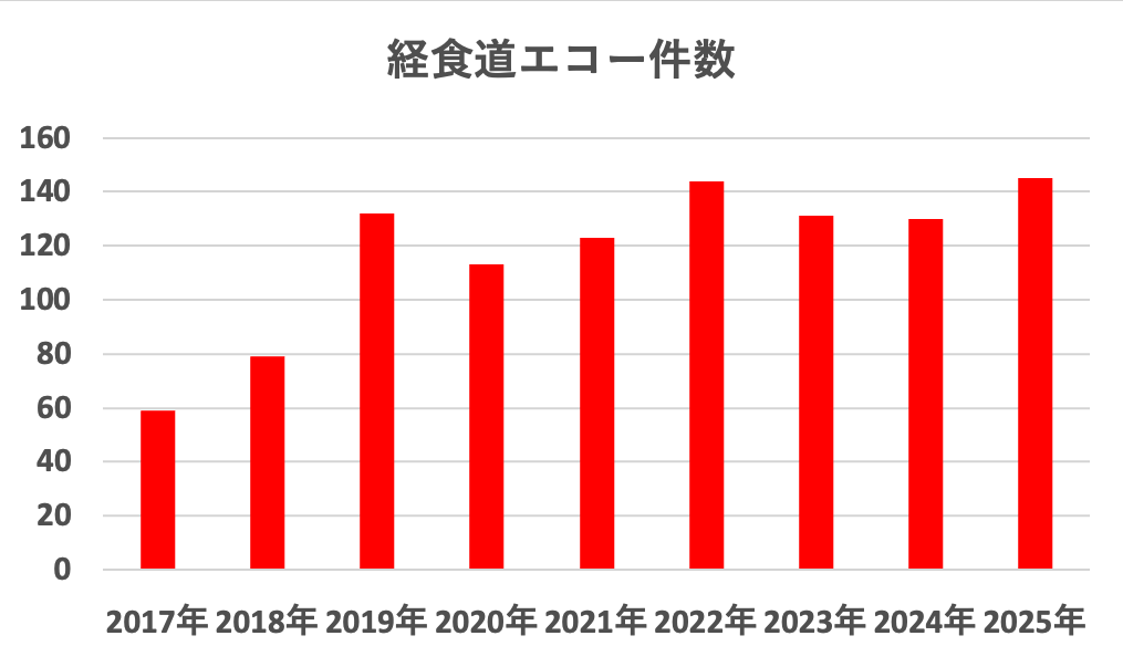 2020年度は、新型コロナウイルス感染症の影響で、学会から経食道エコーも自粛するように通達があり、減少してしまいましたが、 現在では通常通りの診療を行なっております。経食道心エコー、負荷心エコーともに実施できる曜日に限りがありますで、 ご紹介いただきましたのちに予約を組ませていだだきます。ぜひ外来にご紹介ください。